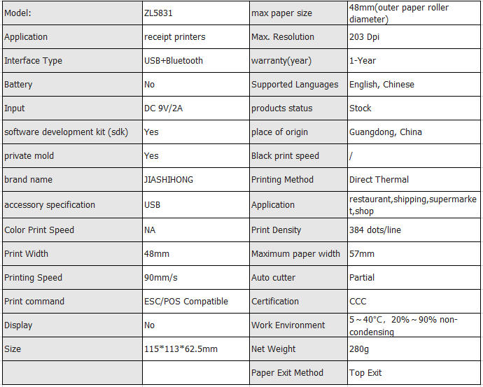 Feature highlights: The ZP5831 portable thermal printer offers versatile wireless printing with USB, Bluetooth, and optional Wi-Fi connectivity, supporting 48mm thermal label and receipt paper. It ensures high performance with a 203 dpi resolution, 90mm/s print speed, and a durable 50KM print head life. Certified with RoHS, CE, CCC and FCC, it guarantees compliance with international safety and environmental standards, providing market access and reliability. The device is backed by ISO9000 quality control systems, ensuring stable performance and prompt after-sales service.